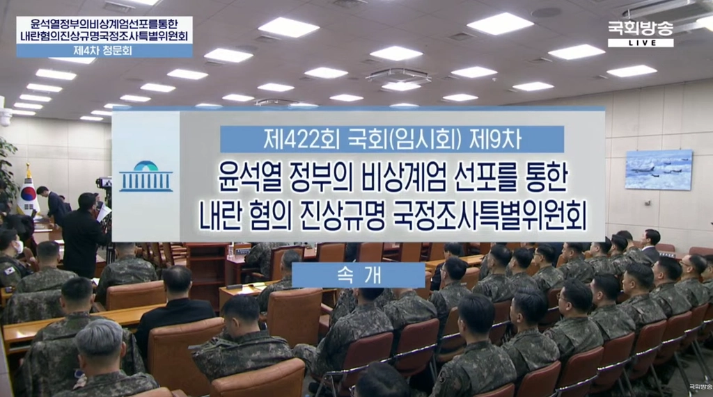 오전 10시 윤석열 정부의 비상계엄 선포를 통한 내란혐의 진상규명 국정조사특별위원회가 국방위원회 회의실에서 열렸음. 이날 회의에서는 의사일정 변경, 동행명령장 발부, 4차 청문회를 진행했으며, 출석한 증인으로는 국가안보실 국방빕서관 최병옥, 국방부장관직무대행 김선호, 방첩사령관직무대리 이경민, 전 육군참모총장 박안수 등 국가안보실, 국방부, 합동참모본부, 방첩사령부, 정보사령부, 육군본부 및 육군, 수도방위사령부, 특수전사령부 관계자들이 있었음.