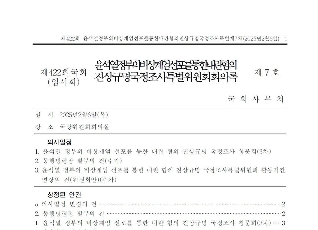 제422회 국회 제7차 윤석열 정부의 비상계엄 선포를 통한 내란혐의 진상규명 국정조사특별위원회가 국방위원회 회의실에서 열렸음. 이날 의사일정 변경, 동행명령장 발부, 3차 청문회 및 국정조사특위 활동기간 연장 등을 심의했음.