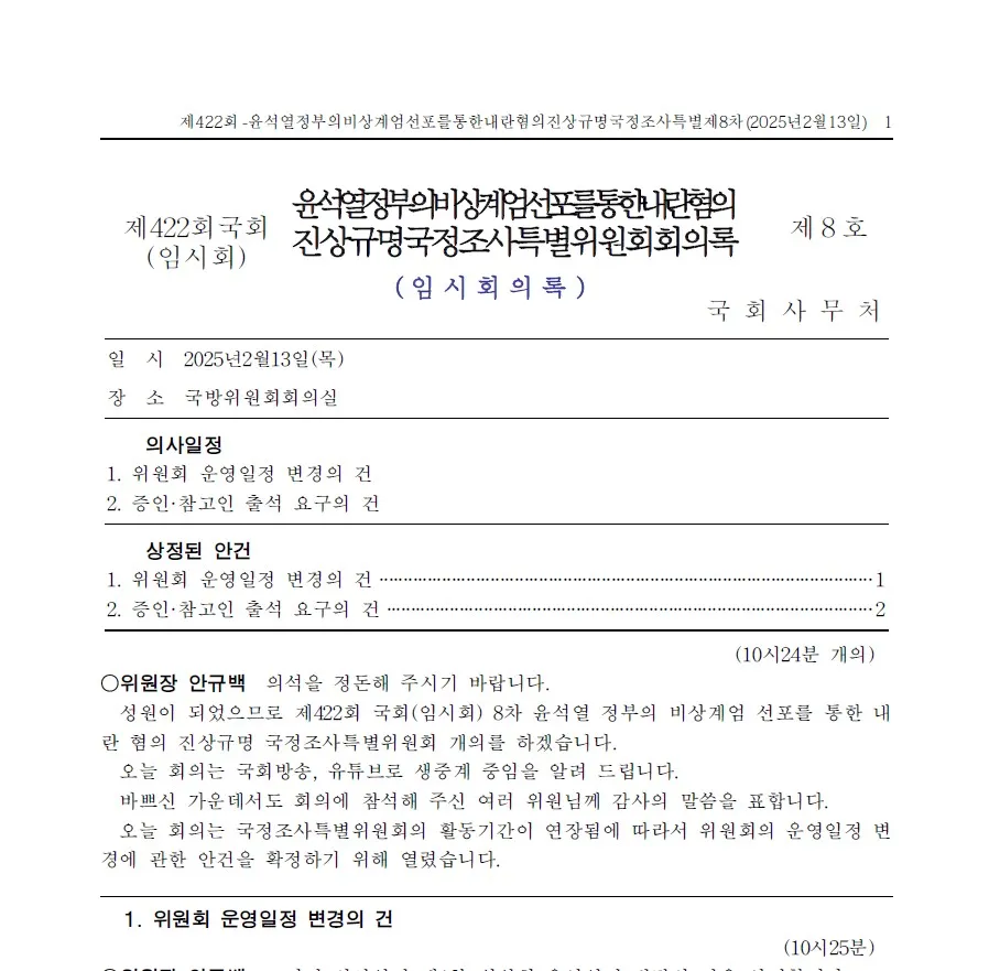 오전 10시 윤석열 정부의 비상계엄 선포를 통한 내란혐의 진상규명 국정조사특별위원회 제8차 전체회의가 국회 본청 국방위원회 회의실에서 열렸음. 이 회의는 국정조사특위 활동 기간이 연장됨에 따라 운영일정 변경을 확정하기 위해 마련된 자리이며, 45일이 지난 이후 21일, 25일 이틀에 걸쳐 두 차례의 청문회를 추가 실시하기로 함.