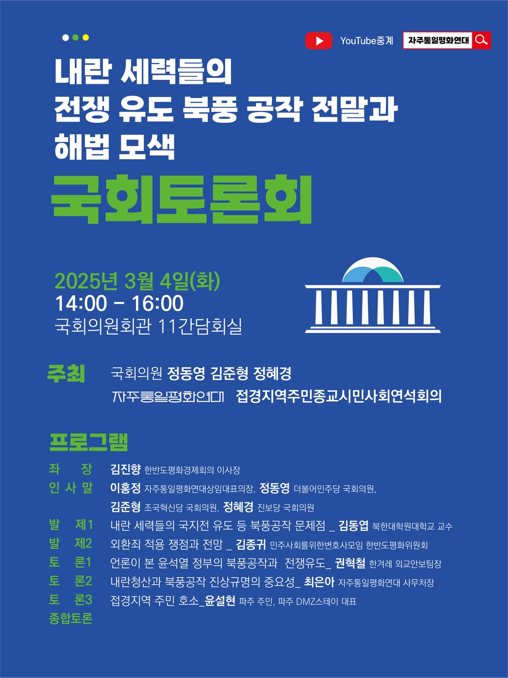 주최 : 정동영 의원실 김준형 의원실 정혜경 의원실 , 자주통일평화연대, 접경지역주민종교시민사회연석회의