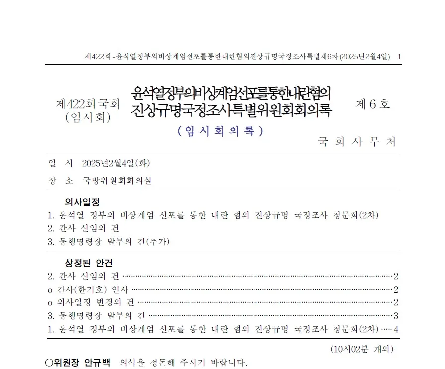 제422회 국회 제6차 윤석열 정부의 비상계엄 선포를 통한 내란혐의 진상규명 국정조사특별위원회 회의록으로, 이날 국조위는 국방위원회 회의실에서 2차 청문회를 진행함. 그 외로 선임된 간사 건과 의사일정 변경, 동행명령장 발부 등이 이루어짐. 출석한 증인은 (전)행정안전부장관 이상민, 중앙선거관리위원회 사무총장 김용빈, 국가안보실 제2차장 인성환, 국가안보실 국방비서관 최병옥, 대통령경호처 지원본부장 김대경, 법제처장 이완규, 행정안전부 경찰국장 박현수, 행정안전부 사회조직과 사무관 손우승, (전)서울경찰청장 김봉식, 서울경찰청 공공안전차장 오부명, (전)서울경찰청 국회경비대장 목현태, 소방청장 허석곤, 소방청 차장 이영팔, 국방부장관직무대행 김선호 등임.
