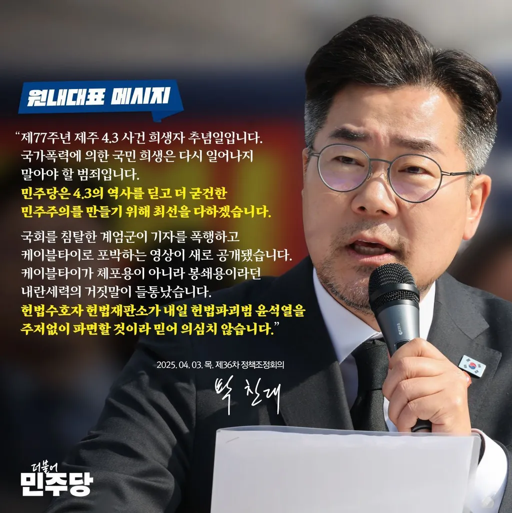 2025년 4월 3일 더불어민주당 제36차 정책조정회의에서 박찬대 원내대표의 발언이다. 4.3의 역사를 딛고 더 굳건한 민주주의를 만들기 위,해 최선을 다하겠으며, 헌법재판소가 헌법파괴범 윤석열을 파면할 것을 기대한다는 내용이다.
