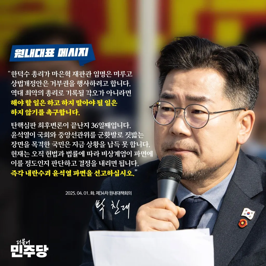 2025년 4월 1일 더불어민주당 제34차 원내대책회의에서 박찬대 원내대표의 발언이다. 한덕수 총리의 마은혁 재판관 임명 거부와 상법개정안 거부권 행사를 비판하고, 윤석열 파면을 촉구하는 내용이다.