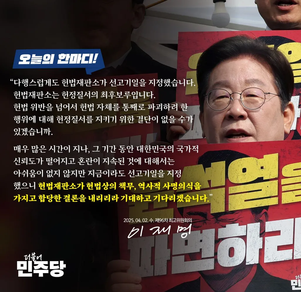 2025년 4월 2일 더불어민주당 제96차 최고위원회의에서 이재명 당대표의 발언이다. 헌법재판소의 선고기일 지정과 관련하여 헌법상의 책무와 역사적 사명의식을 가지고 합당한 결론을 내릴 것을 기대한다는 내용이다.