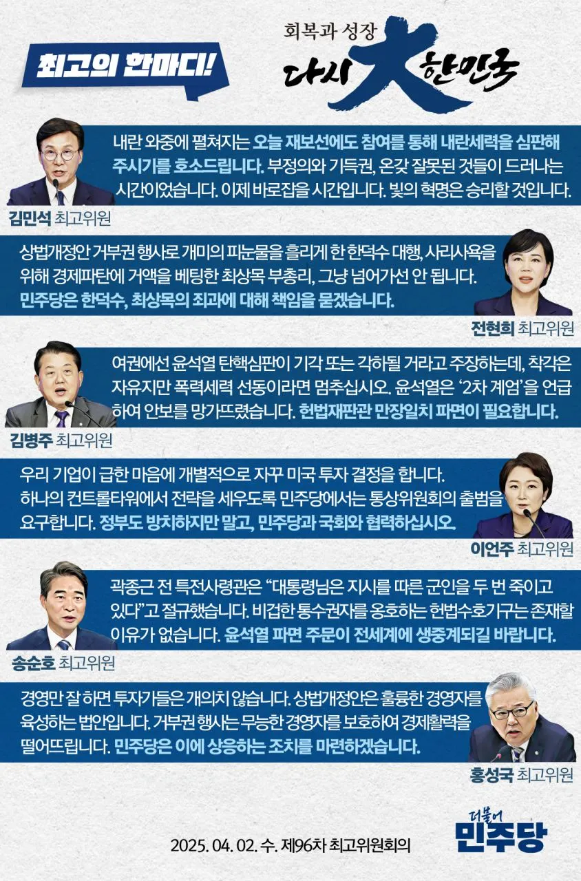 2025년 4월 2일 더불어민주당 제96차 최고위원회의에서 최고위원들의 발언이다. 재보선 참여를 통한 내란세력심판, 한덕수와 최상목 죄과에 대한 책임 묻기, 헌법재판소의 만장일치 파면 촉구 등의 내용이다.