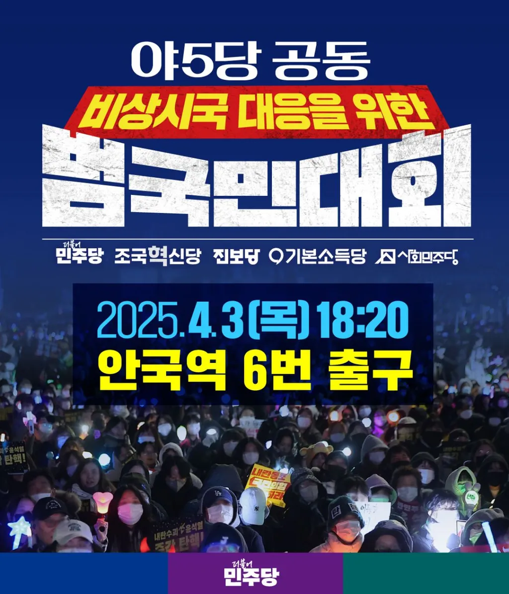 2025년 4월 3일 발표한 야5당(더불어민주당, 조국혁신당, 진보당, 기본소득당, 사회민주당) 공동 비상시국 대응을 위한 범국민대회와 관련한 더불어민주당 포스터이다.