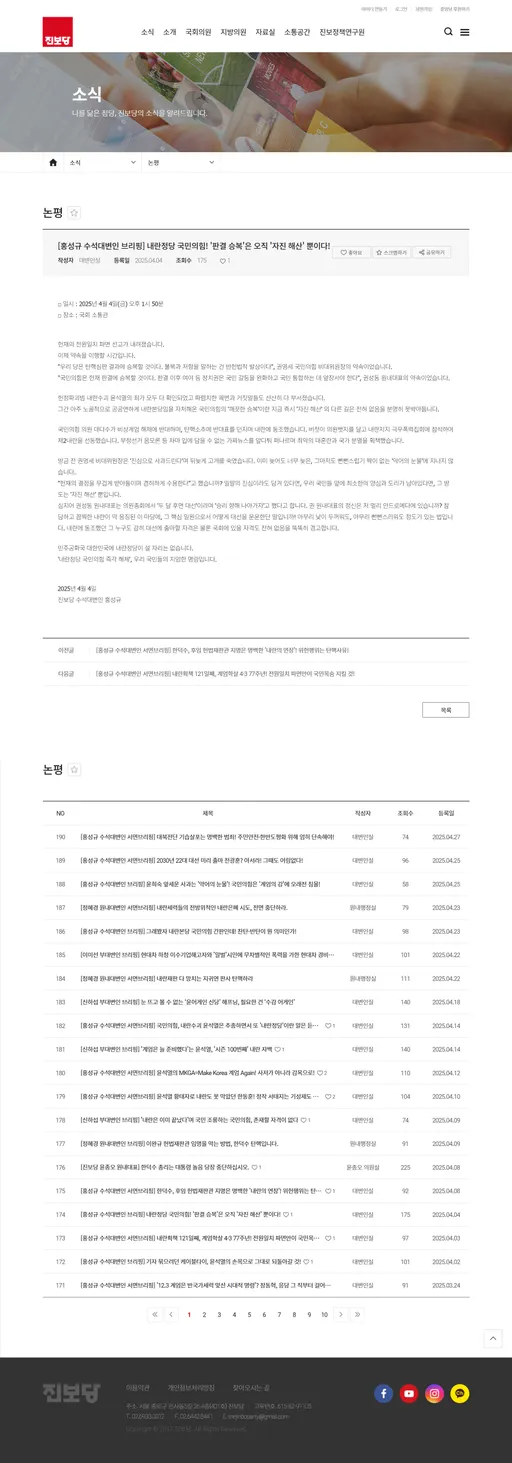2025년 4월 4일 진보당 홍성규 수석대변인의 브리핑이다. 윤석열 파면선고와 관련하여 국민의힘의 탄핵심판 결과에 승복할 것을 촉구하며, 내란정당의 즉각 해체를 촉구하는 내용이다.