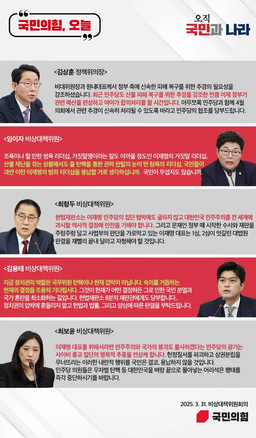 2025년 4월 1일 국민의힘 원내대책회의에서 발언한 내용이다. 더불어민주당의 추경 불협조 등을 비판하는 내용이다.