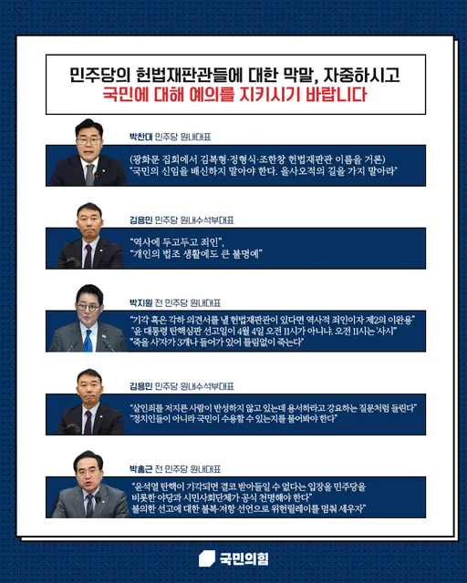 2025년 4월 3일 국민의힘 카드뉴스이다. 헌법재판관을 비판하는 더불어민주당 의원들을 비판하는 내용이다.