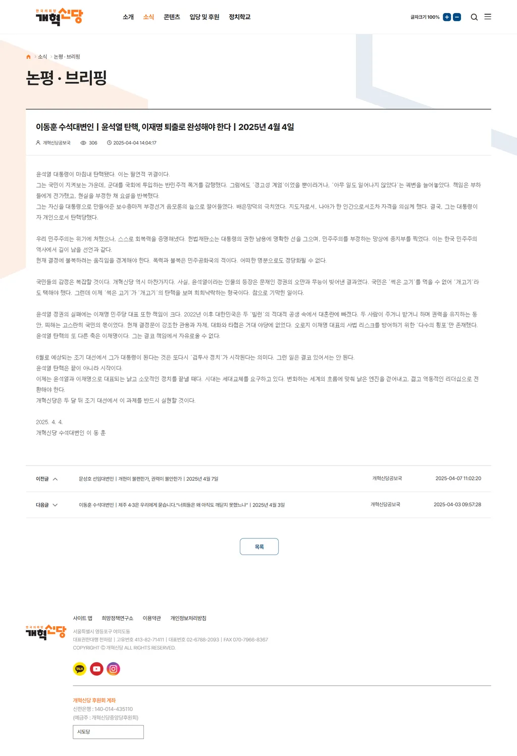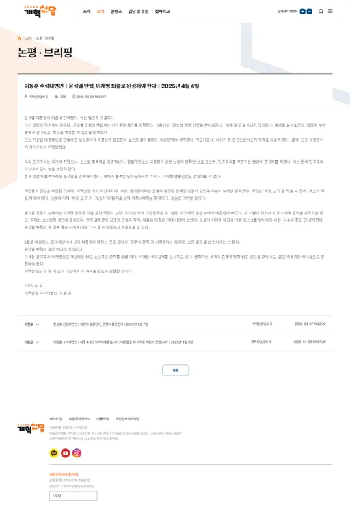 2025년 4월 4일 발표한 개혁신당 수석대변인 이동훈의 논평 · 브리핑이다. 윤석열 대통령의 탄핵에 대해 '필연적 귀결'이라고 평하며, 민주주의의 위기 극복을 축하하는 내용이다. 또한 이번 사태의 책임이 문재인 정권과 이재명 민주당 대표에게 있음을 언급하며 조기 대선에서의 세대교체를 주장하고 있다.