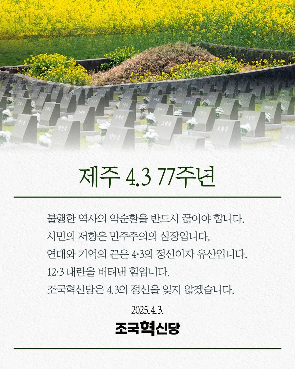 2025년 4월 3일 조국혁신당에서 발표한 카드뉴스이다. 제주 4·3사건 77주년을 기리며 동시에 시민의 저항과 민주주의 정신을 통해 12·3사태 또한 이겨내야 한다는 내용이다.