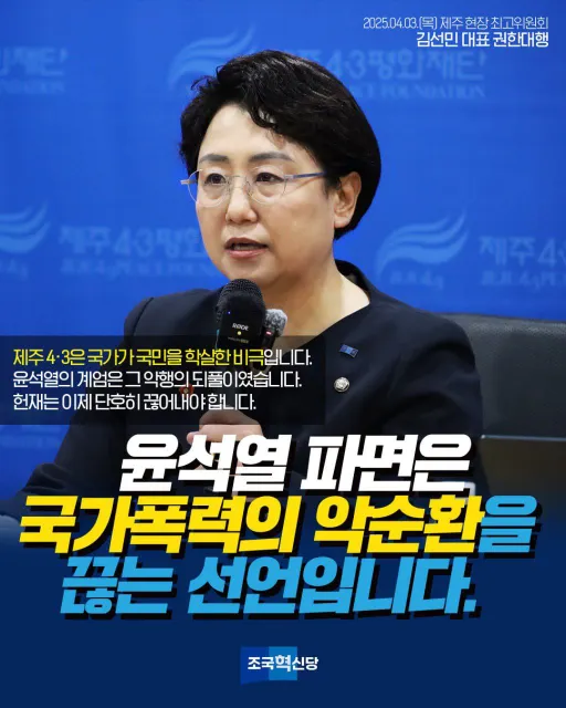 2025년 4월 3일 조국혁신당에서 발표한 카드뉴스이다. 조국혁신당 대표 권한대행 김선민 의원이 2025년 4월 3일 열린 최고위원회에서 윤석열 대톨령의 계엄은 국가폭력이며 파면을 통해 악순환을 끝내야한다고 발언하고 있다.