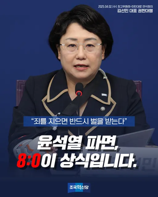 2025년 4월 2일 조국혁신당에서 발표한 카드뉴스이다. 2025년 4월 2일 진행되었던 탄탄대로위원회 및 최고위원회에서 조국혁신당 대표 권한대행 김선민 의원이 윤석열 대통령의 파면은 헌법재판소의 8:0 판결이 당연한 것이라고 주장하고 있는 내용이다.