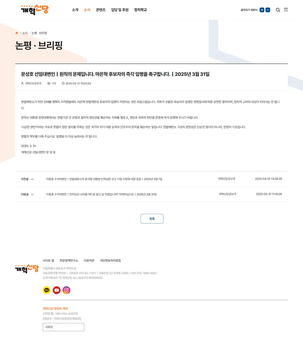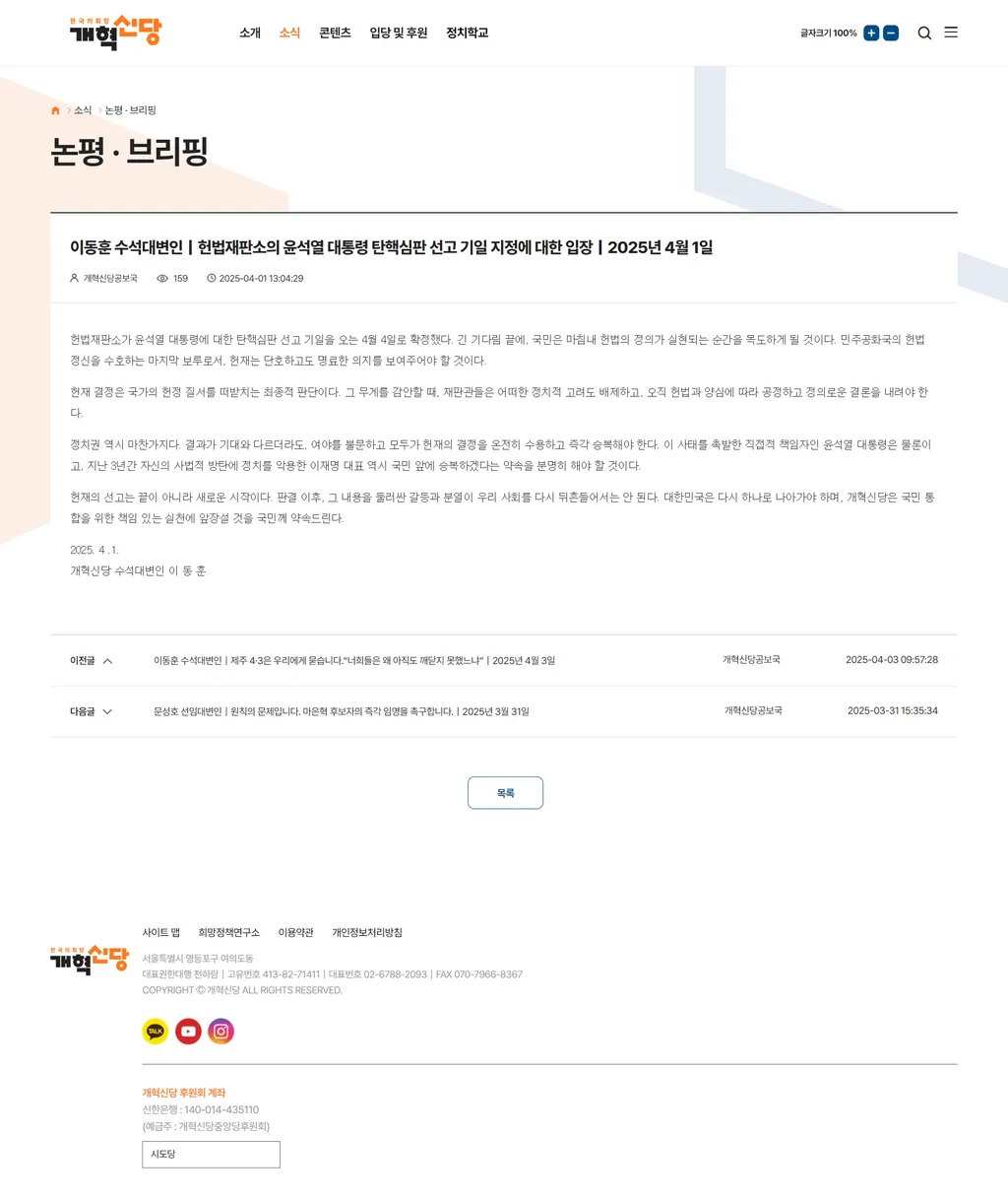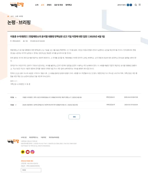 2025년 4월 1일 발표한 개혁신당 수석대변인 이동훈의 논평 · 브리핑이다. 헌법재판소가 윤석열 대통령에 대한 탄핵심판 선고 기일을 확정한 건에 대해 헌법재판소의 공정하고 정의로운 결정을 요청하면서, 정치권이 여야를 불문하고 헌재의 결정에 승복해야 한다는 내용이다. 또한 이재명 대표의 사법적 방탄을 비판하는 내용을 담고 있기도 하다.