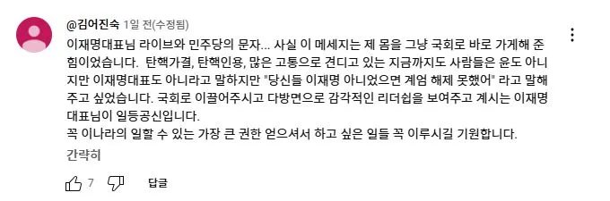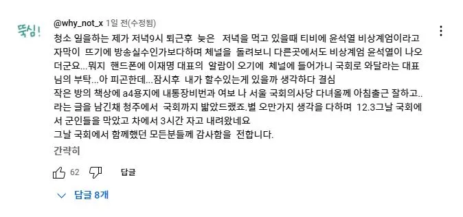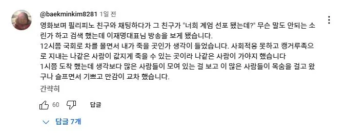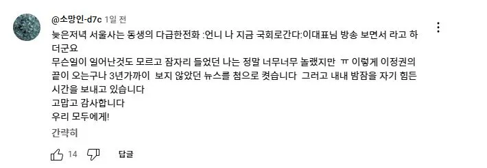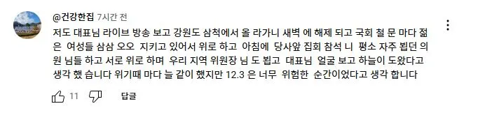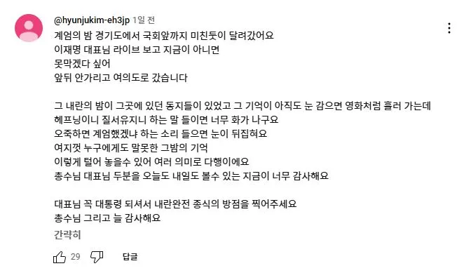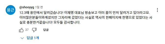 2025년 2월 11일 더불어민주당 이재명 대표가 유튜브 뉴스공장 라이브에 출연하여 1203 비상계엄과 당시 본인의 라이브 방송에 대해 언급하자 당일 국회로 달려 온 사람들이 자신들의 경험담을 댓글로 올렸다.<댓글내용>다음날 방송을 보고 저 역시도 댓글로 남겨야갰다 싶어서 남겨봅니다.계엄선포를 생방송을 보고나서 이걸 어째야하나 하던 와중,이재명대표님의 다급한 말씀을 듣곤 고민 1도없이 외투걸치고 바로 뛰어갔습니다.가면서 머리속에 들었던 생각은 제 조카와 어린분들이 군부독재시대에 살게해선 안되겠다 생각하면서 갔었습니다.