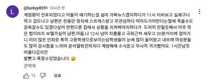 2025년 2월 11일 더불어민주당 이재명 대표가 유튜브 뉴스공장 라이브에 출연하여 1203 비상계엄과 당시 본인의 라이브 방송에 대해 언급하자 당일 국회로 달려 온 사람들이 자신들의 경험담을 댓글로 올렸다.<댓글내용>계엄령이 선포되었다고 아들이 얘기하는걸 설마 가짜뉴스겠지하다가 11시 티비보고 실제구나 하고 겁도나고 남편은 한동안 정치에 스트레스받고 무관심하다 여의도가야한다는말에 죽을수도 감옥갈수도 있겠다싶어 한편으론 집에서 상황을 지켜봐야지하다가 도저히 안될듯해서 아주 작은 힘이라조 보탤가싶어 남편,아들,나 12시 넘어 차를몰고 국회근처 세우고 20분거리에 걸어가니 이미 많은 인파로 특히 고등학생으로보이는남학생들이 눈에 많이 들어왔고 내또래 여성분들도 많아 감사함을 느끼며 윤석열퇴진외치다 계엄해제 소식듣고 무사히 귀가했어요. 1시간남짓 머물다갔지만발뻗고 푹잘수있었습니다.