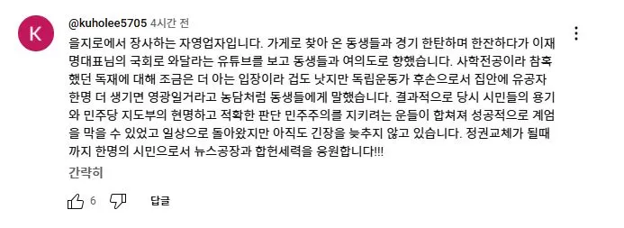 2025년 2월 11일 더불어민주당 이재명 대표가 유튜브 뉴스공장 라이브에 출연하여 1203 비상계엄과 당시 본인의 라이브 방송에 대해 언급하자 당일 국회로 달려 온 사람들이 자신들의 경험담을 댓글로 올렸다.<댓글내용>을지로에서 장사하는 자영업자입니다. 가게로 찾아 온 동생들과 경기 한탄하며 한잔하다가 이재명대표님의 국회로 와달라는 유튜브를 보고 동생들과 여의도로 향했습니다. 사학전공이라 참혹했던 독재에 대해 조금은 더 아는 입장이라 겁도 낫지만 독립운동가 후손으로서 집안에 유공자 한명 더 생기면 영광일거라고 농담처럼 동생들에게 말했습니다. 결과적으로 당시 시민들의 용기와 민주당 지도부의 현명하고 적확한 판단 민주주의를 지키려는 운들이 합쳐져 성공적으로 계엄을 막을 수 있었고 일상으로 돌아왔지만 아직도 긴장을 늦추지 않고 있습니다. 정권교체가 될때까지 한명의 시민으로서 뉴스공장과 합헌세력을 응원합니다!!!