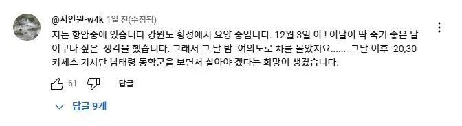 2025년 2월 11일 더불어민주당 이재명 대표가 유튜브 뉴스공장 라이브에 출연하여 1203 비상계엄과 당시 본인의 라이브 방송에 대해 언급하자 당일 국회로 달려 온 사람들이 자신들의 경험담을 댓글로 올렸다.<댓글내용>저는 항암중에 있습니다 강원도 횡성에서 요양 중입니다. 12월 3일 아 ! 이날이 딱 죽기 좋은 날 이구나 싶은 생각을 했습니다. 그래서 그 날 밤 여의도로 차를 몰았지요...... 그날 이후 20,30 키세스 기사단 남태령 동학군을 보면서 살아야 겠다는 희망이 생겼습니다.