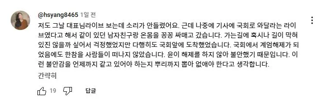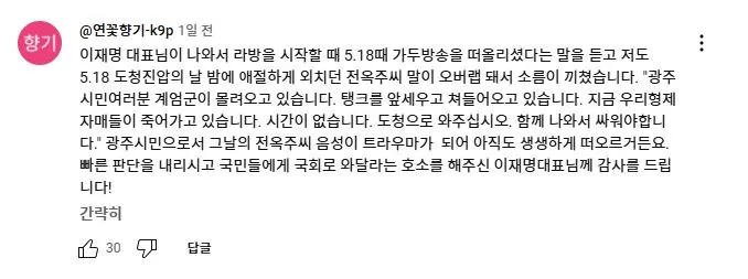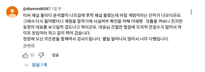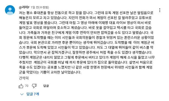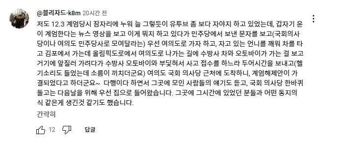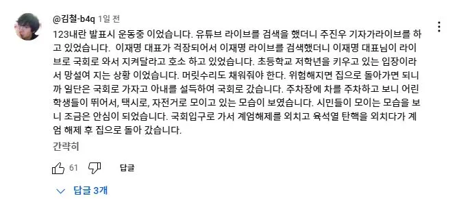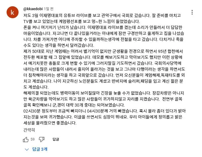 2025년 2월 11일 더불어민주당 이재명 대표가 유튜브 뉴스공장 라이브에 출연하여 1203 비상계엄과 당시 본인의 라이브 방송에 대해 언급하자 당일 국회로 달려 온 사람들이 자신들의 경험담을 댓글로 올렸다.<댓글내용>저도 3일 이재명대표의 유튜브 라이브를 보고 관악구에서 국회로 갔습니다. 잘 준비를 마치고 TV를 보고 있었는데 계엄령선포를 보고 멍~한 느낌이 들었었습니다. 폰을 켜니 여기저기 난리가 났습니다. 이재명대표 라이브를 켰는데 소리가 안들려서 더 답답한 마음이었습니다. 자고나면 다 끝나있을거라는 아내에게 잠깐 구경만하고 올게하고 집을 나섰습니다. 차를 가져가면 어디에 주차할 수 있을까하는생각에 전철을 타고 갔습니다. 다치거나 죽을수도 있다는 생각을 하면서 달려갔습니다.제가 50대로 지난 계엄때는 어려서 별기억이 없지만 군생활을 전경으로 하면서 95년 합천에서 전두환 체포할 때 그 집앞에 있었습니다. 데모를 해보기도하고 막아보기도 했지만 이런 상황에서 예기치못한 충돌로 크게 변할 수 있기에 그러지말길 기도하면서 갔습니다. 국회의사당역에 내리는데 많은 사람들이 내려서 줄지어 올라가는 것을 보고 그나마 다행이라는 생각을 하면서도 더 침착해야지라는 생각을 하고 국회앞으로 갔습니다. 먼저 오신분들이 계엄해제,독재타도를 외치고 계셨습니다. 나이 지긋하신 노인분들도 계셨고 반바지에 슬리퍼,패딩을 입고 계신 젊은 분도 계셨습니다.해제의결 되었는데도 병력이동이 보이질않아 긴장을 늦출 수가 없었습니다. 장갑차량은 아니지만 육군차량을 막아보기도 하고 많은 사람들이 귀가하지않고 자리를 지켰습니다. 전면부 골목골목 확인해보니 군,경이 대략 30개 중대는 되어보였습니다.02시30분 정도부터 조금씩 빠지더니 04시30분께 거의 빠졌습니다. 혹시 몰라 좀더 있다가 밝아지는것을 보며 귀가했습니다. 이글을 쓰면서도 심장이 뛰네요. 우리 아이들에게 정의롭고 밝은세상을 물려줬으면 좋겠습니다.