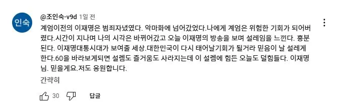 2025년 2월 11일 더불어민주당 이재명 대표가 유튜브 뉴스공장 라이브에 출연하여 1203 비상계엄과 당시 본인의 라이브 방송에 대해 언급하자 당일 국회로 달려 온 사람들이 자신들의 경험담을 댓글로 올렸다.<댓글내용>계엄이전의 이재명은 범죄자녔였다. 악마화에 넘어갔었다.나에게 계엄은 위험한 기회가 되어버렸다.시간이 지나며 나의 시각은 바뀌어갔고 오늘 이재명의 방송을 보며 설레임을 느낀다. 흥분된다. 이재명대통시대가 보여줄 세상.대한민국이 다시 태어날기회가 될거라 믿음이 날 설레게 한다.60을 바라보게되면 설렘도 즐거움도 사라지는데 이 설렘에 힘든 오늘도 덜힘들다. 이재명님. 믿을게요.저도 응원합니다.