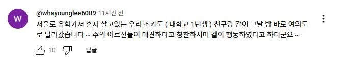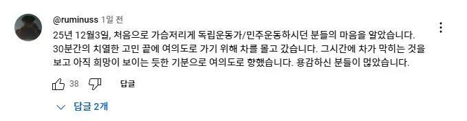 2025년 2월 11일 더불어민주당 이재명 대표가 유튜브 뉴스공장 라이브에 출연하여 1203 비상계엄과 당시 본인의 라이브 방송에 대해 언급하자 당일 국회로 달려 온 사람들이 자신들의 경험담을 댓글로 올렸다.<댓글내용>저는 자다 깨서 늦게 출발했어요. 술 마시고 들어온 남편대신 운전을 하는데,, 가는 내내 두렵고 무서웠습니다ㅠ 실은 12.3 몇주 전에 ‘소년이 온다’를 읽었거든요. 하루면 읽을 수 있는 분량이지만 너무 힘들어서 일주일만에 완독을 하고, 그 여운이 가시지 않았던 때였습니다. 국회로 향하면서.. 나도 남편도,, ‘죽을 수도 있겠구나’, ‘다칠 수도 있겠구나’.. 너무 많은 무서운 생각이 사로잡혔지만, 저희는 애가 없어서 그렇게 희생되더라도 역사를 바로잡는 작은 역할이 된다면 그래도 어쩔 수 없다 라는 마음을 먹고 차를 세우고 국회로 걸어갔어요. 그런데 여의도 공원즈음에서 신호를 기다리는데 한분, 두분, 이렇게 몇 십명이 모이기 시작했는데... 혼자가 아니라는 생각, 올바른 일에 동참하고 있구나 등등 그때의 그 뭉클함이 아직도 생생해서 눈물이 나요ㅠ 이재명 대표님, 그날 나와주시고 지금도 싸워주시고 계신 여러분, 모두 영웅이세요. 존경합니다!