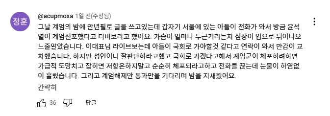 2025년 2월 11일 더불어민주당 이재명 대표가 유튜브 뉴스공장 라이브에 출연하여 1203 비상계엄과 당시 본인의 라이브 방송에 대해 언급하자 당일 국회로 달려 온 사람들이 자신들의 경험담을 댓글로 올렸다.<댓글내용>그날 계엄의 밤에 만년필로 글을 쓰고있는데 갑자기 서울에 있는 아들이 전화가 와서 방금 윤석열이 계엄선포했다고 티비보라고 했어요. 가슴이 얼마나 두근거리는지 심장이 입으로 튀어나오느줄알았습니다. 이대표님 라이브보는데 아들이 국회로 가야할것 같다고 연락이 와서 만감이 교차했습니다. 하지만 성인이니 잘판단하라고했고 국회로 가겠다고해서 계엄군이 체포하려하면 가급적 도망치고 잡히면 저항은하지말고 순순히 체포되라고하고 전화를 끊는데 눈물이 하염없이 흘렀습니다. 그리고 계엄해제안 통과만을 기다리며 밤을 지새웠어요.